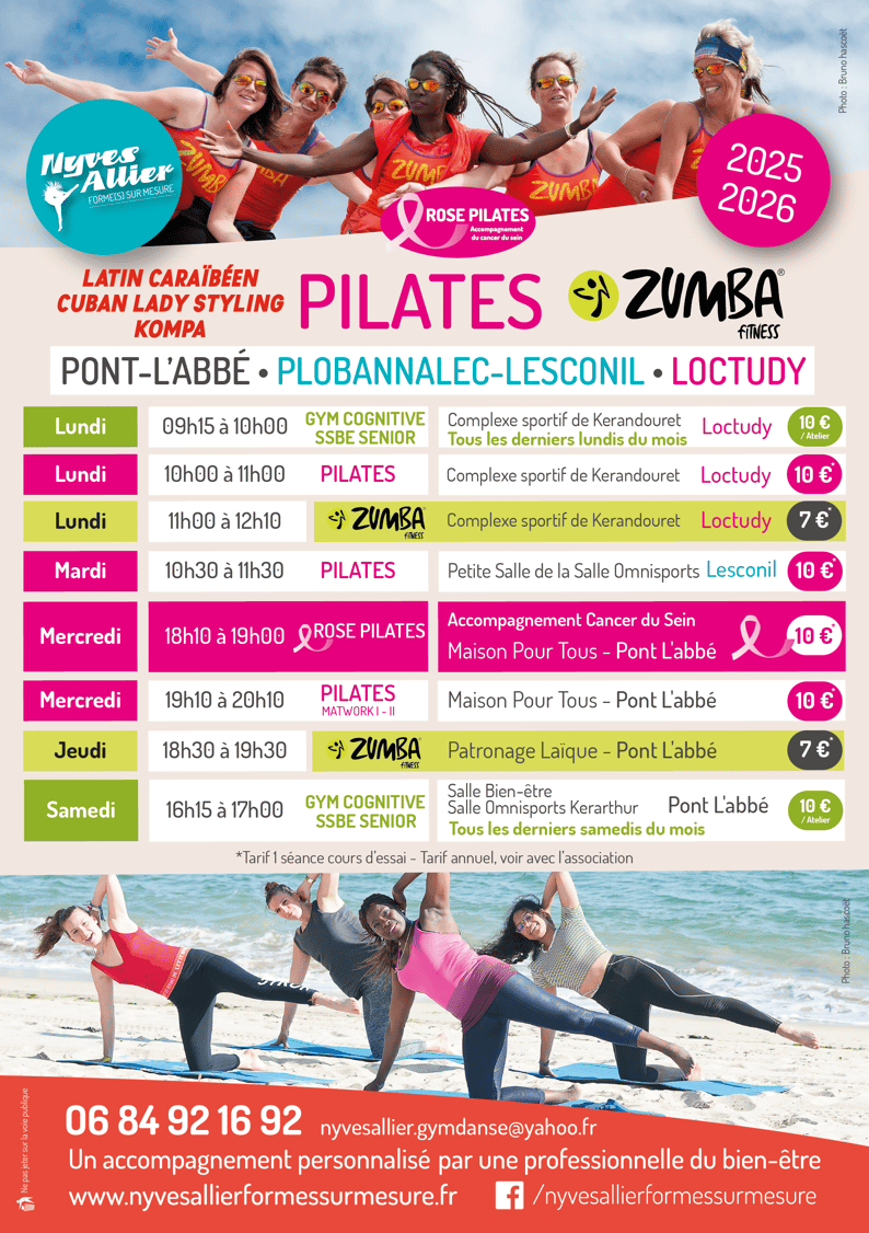 Planning des Cours de l'année 2025-2026 de PILATES, ZUMBA, CUBAN LADY STYLING, GYM COGNITIVE SSBE SENIOR, ROSE PILATES à Pont-l'Abbé, Plobannalec-Lesconil, Loctudy, Pont-Aven, Quimper - Par Nyves Allier, association Gym Bien-être